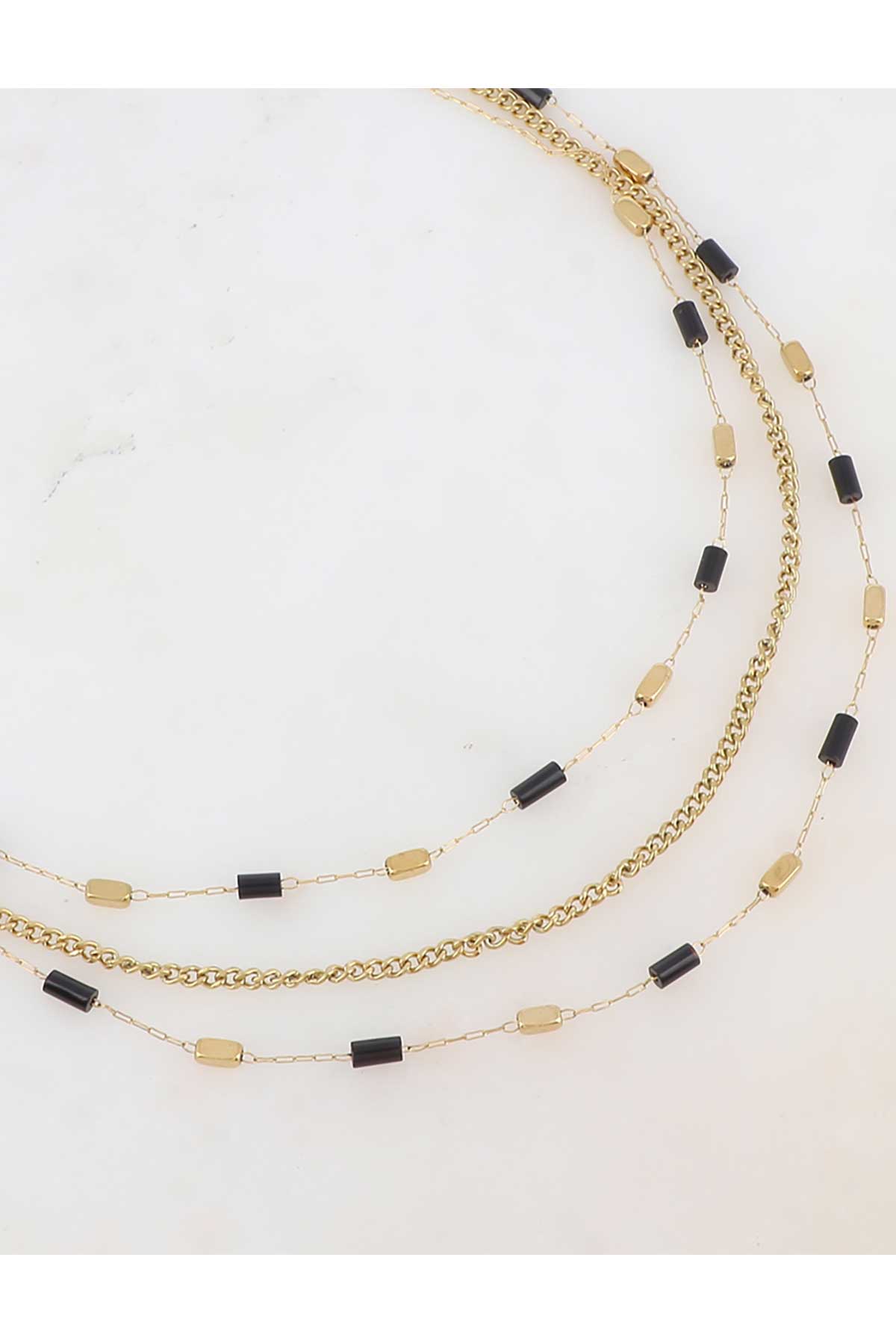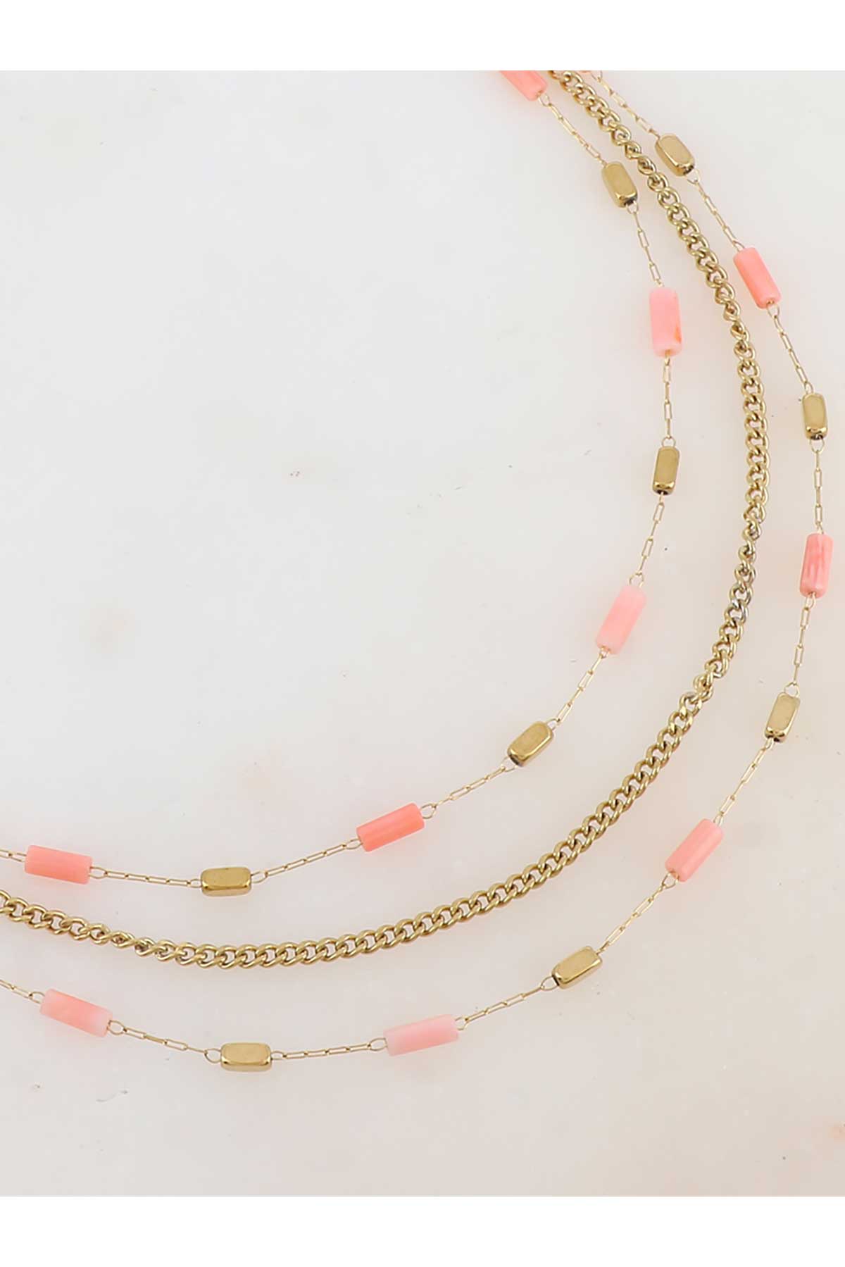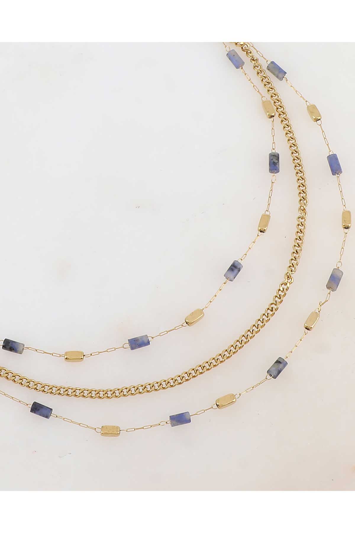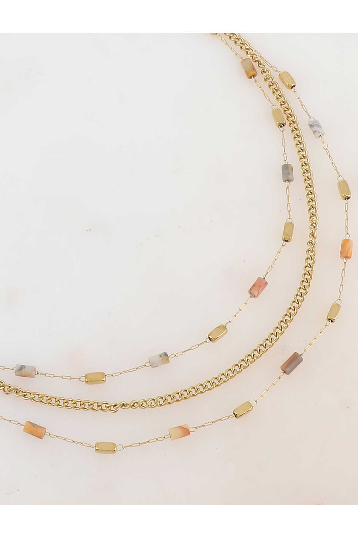 Hálsmen á þríraða keðju með krabbakló og stillanlegri keðju skreytt með náttúrusteinssteinum.